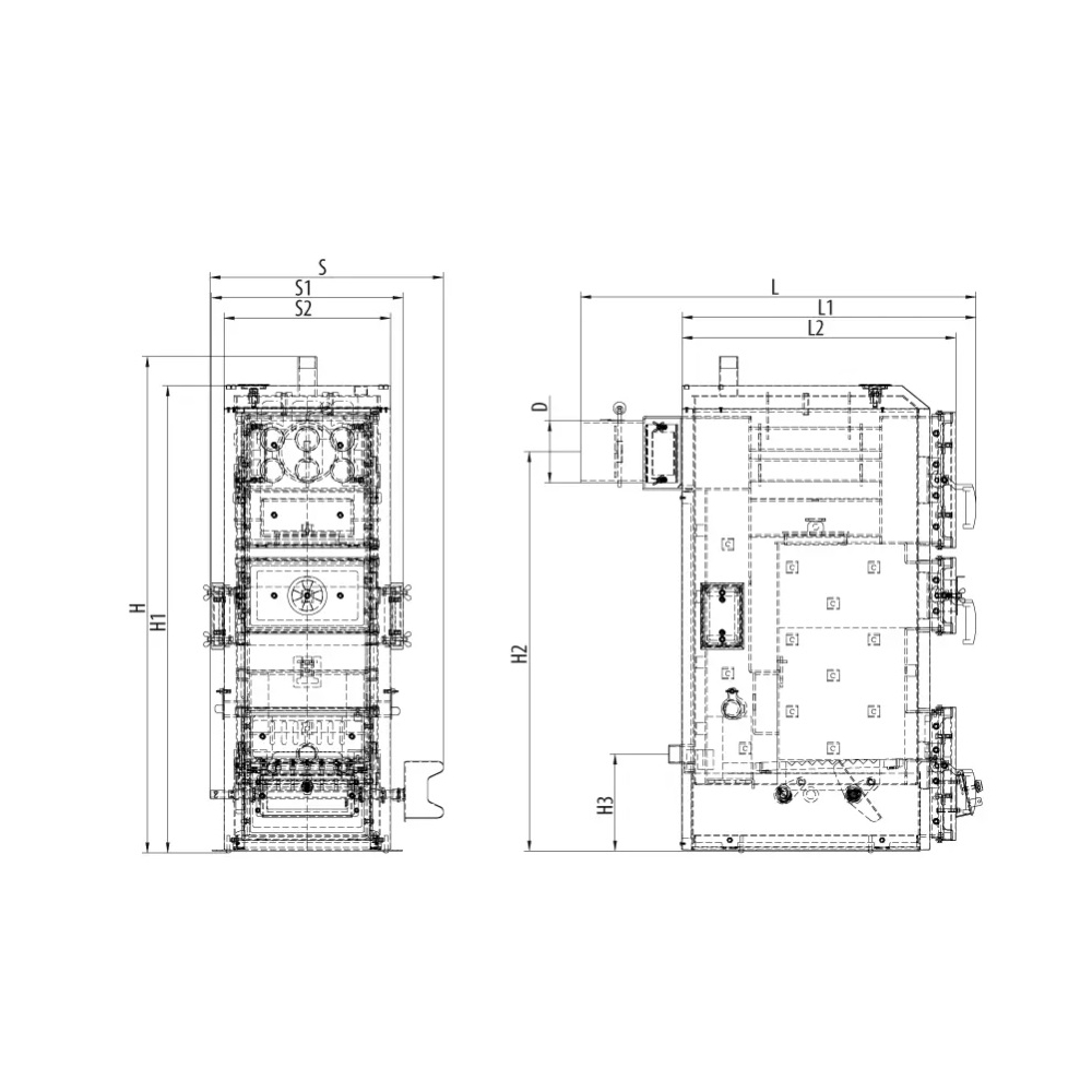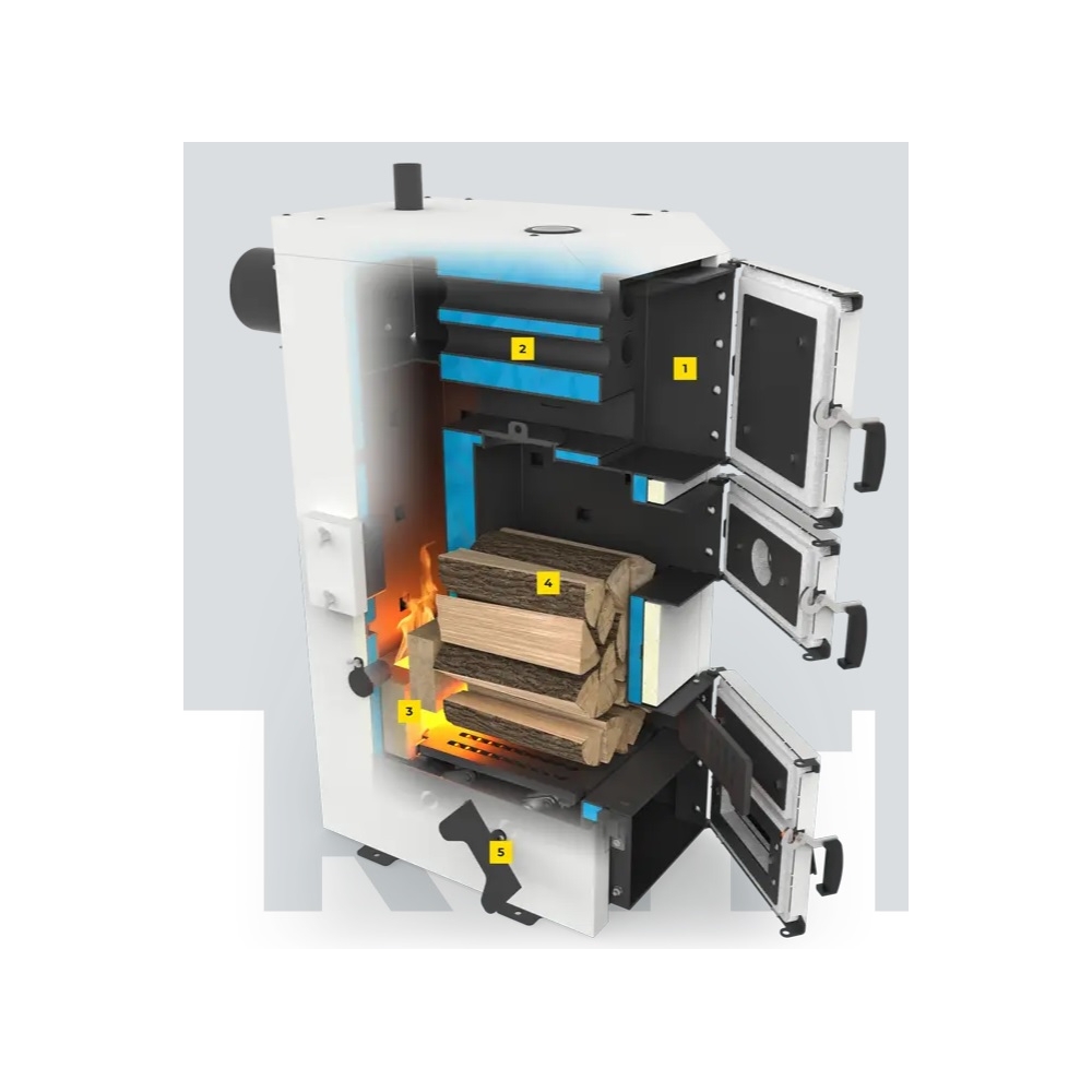 - Wielociągowy kanał spalinowy zapewnia wydajną pracę i wzmacnia konstrukcję kotła.