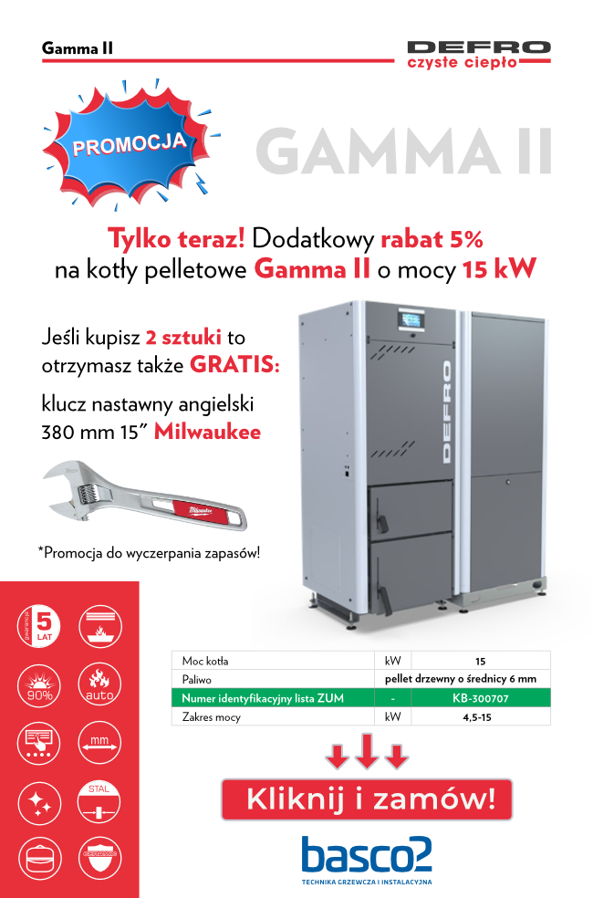 Dodatkowo, dla naszych partnerów, którzy zdecydują się na zakup 2 sztuk kotłów DEFRO Gamma II 15 kW, przygotowaliśmy atrakcyjny GRATIS – profesjonalny klucz nastawny angielski 380 mm Milwaukee. To wysokiej jakości narzędzie, cenione za swoją niezawodność i ergonomię, które z pewnością znajdzie zastosowanie w codziennej pracy instalacyjnej. Klucz Milwaukee jest nie tylko wartością dodaną do zakupu, ale także elementem budującym Państwa profesjonalny wizerunek w oczach końcowego klienta.