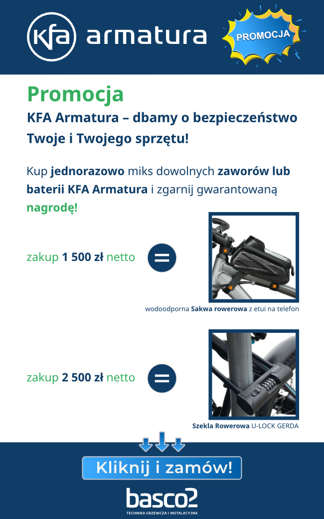 W ramach współpracy Basco 2 z KFA Armatura przygotowaliśmy promocję, która realnie nagradza Twoje kompleksowe zamówienia. Kupując zawory i baterie KFA z naszej hurtowni, zyskujesz praktyczne akcesoria do zabezpieczenia swojego roweru i sprzętu.