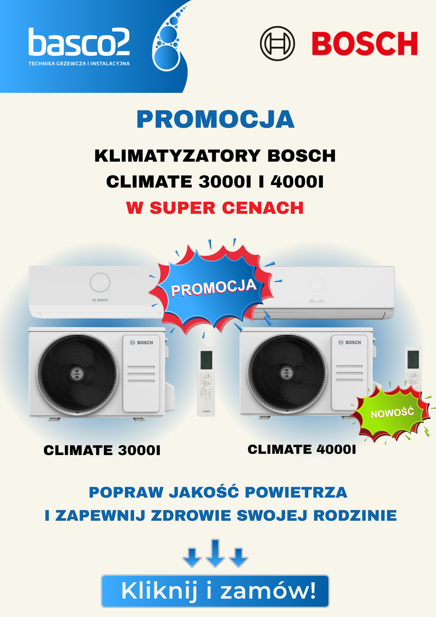 Poznaj naszą nową ofertę klimatyzatorów ściennych marki Bosch – Climate 3000i i Climate 4000i – zaprojektowanych z myślą o nowoczesnym komforcie i energooszczędności.