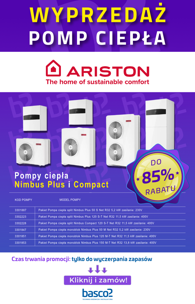 Wychodząc naprzeciw oczekiwaniom szybkiego dostępu do produktów i atrakcyjnych cen, ogłaszamy specjalną, ograniczoną czasowo wyprzedaż magazynową pomp ciepła ARISTON z serii Nimbus Plus i Compact.