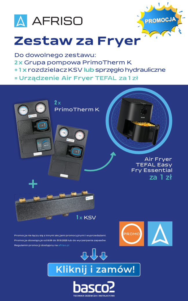 Kupując dowolny zestaw składający się z dwóch grup pompowych PrimoTherm K oraz rozdzielacza KSV lub sprzęgła hydraulicznego, macie Państwo możliwość odebrania frytkownicy beztłuszczowej Air Fryer TEFAL za jedyne 1 zł!