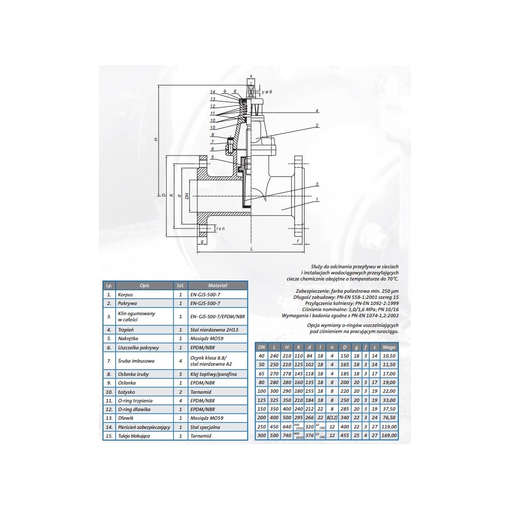 - Ciśnienie nominalne: 1,0/1,6 MPa; PN 10/16