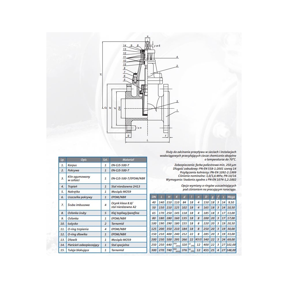 Służy do odcinania przepływu medium w sieciach i instalacjach wodociągowych przesyłających ciecze chemicznie obojętne o temperaturze do 70°C.