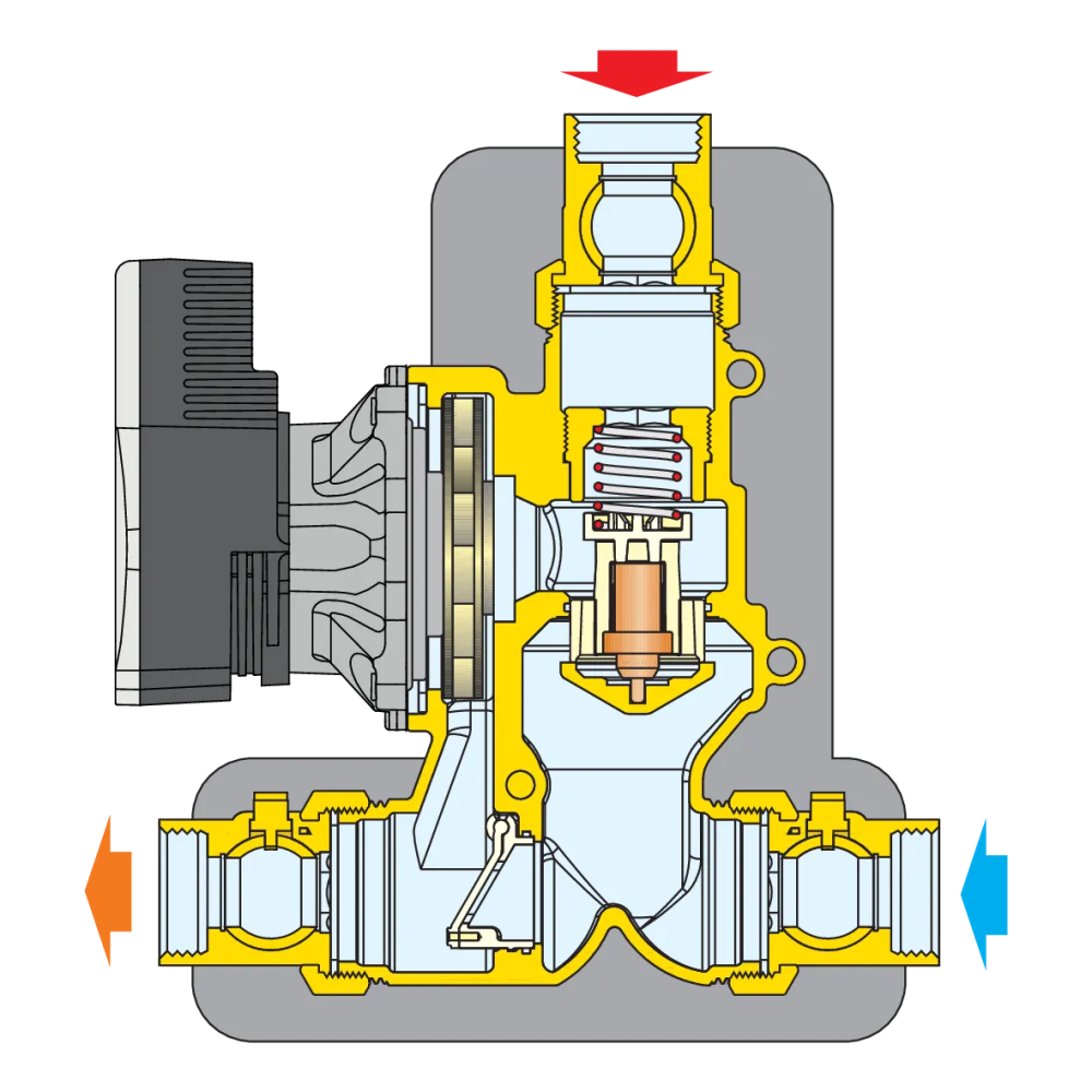 Grupa pompowa do cyrkulacji czynnika grzewczego z zaworem termostatycznym zabezpieczającym kotły na paliwo stałe przed zbyt niską temperaturą powrotu (z izolacją).
