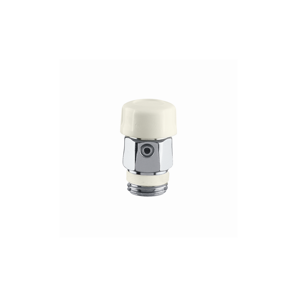 Ręczny zawór odpowietrzający do grzejników z zamknięciem gumowym Białe pokrętło, kwasoodporne. Gwint z uszczelką PTFE. Przyłącze: G 1/2" A (ISO 228-1) GZ. Maksymalne ciśnienie pracy: 10 bar. Zakres temperatury medium: 5–90 °C. Wykończenie: chromowane. Materiał: mosiądz.
