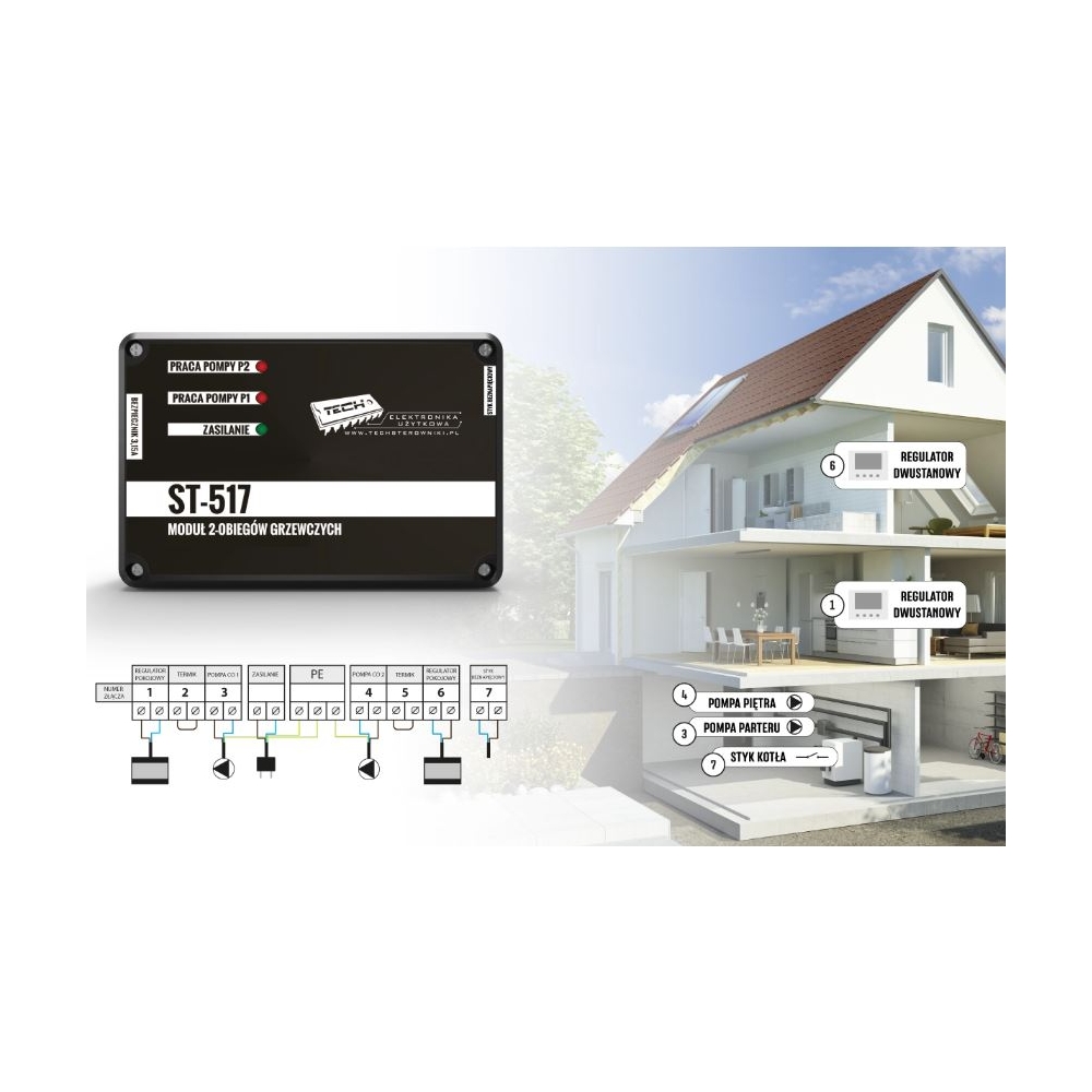 Integrator obiegów grzewczych to sterownik do instalacji, który jest przystosowany do obsługi dwóch obiegów grzewczych. Umożliwia połączenie 2 pomp CO w celu optymalizacji pracy systemu grzewczego. Dwie pompy w CO – jak działa integrator Sterownik na 2 pompy CO współpracuje z dwoma regulatorami pokojowymi oraz steruje stykiem beznapięciowym. Po otrzymaniu sygnału z regulatora pokojowego o niedogrzaniu pomieszczenia integrator pomp CO załącza odpowiednią pompę. Jeśli którykolwiek z obiegów zgłasza niedogrzanie, sterownik 2 pomp CO załącza styk beznapięciowy. Integrator obiegów grzewczych w systemie podłogowym Gdy sterownik na 2 pompy CO ma obsługiwać instalację podłogową, należy zastosować dodatkowy czujnik bimetaliczny (umiejscowiony na rurze zasilania jak najbliżej kotła) – termik. W razie przekroczenia temperatury alarmowej termik odłączy pompę – nie dopuści do przegrzania delikatnej instalacji podłogowej. W przypadku stosowania modułu ST-517 do zwykłej instalacji można termik zastąpić zworą – łączymy zaciski wejściowe termika. Sterownik 2 pomp CO– zasady bezpieczeństwa Integrator pomp CO to urządzenie, które umożliwia połączenie dwóch pomp na jednym sterowniku, zwiększyć wydajność instalacji i przyczynić się do redukcji kosztów ogrzewania. Warto tylko pamiętać, że urządzenie powinno być montowane wyłącznie przez osobę z odpowiednimi kwalifikacjami. Błędne podłączenie przewodów może spowodować uszkodzenie sterownika.
