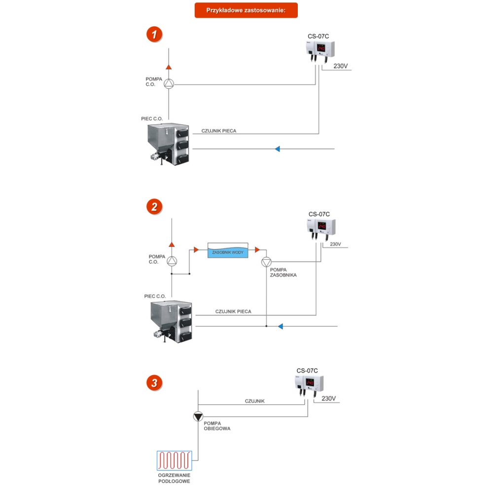 Sterownik CS-07C może być zastosowany jako termostat lub sterownik pompy podłogowej. W urządzeniu mamy możliwość regulowania temperatury załączenia jak i wyłączenia pompy. Pompa załącza się po przekroczeniu ustawionej przez użytkownika temperatury załączenia (O) wyłączy po przekroczeniu ustawionej temperatury wyłączenia (U).