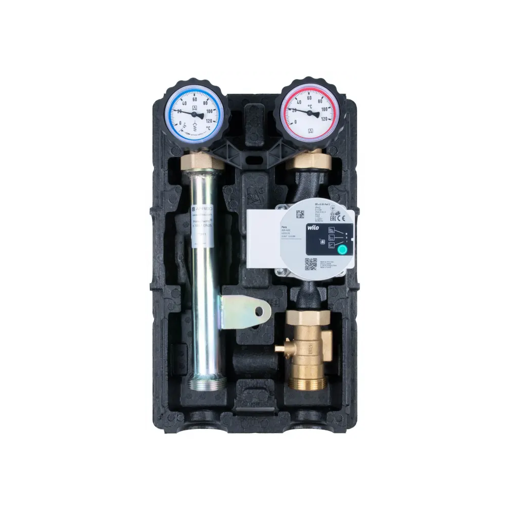 - Wyposażona w niezbędne komponenty: termometry, zawór zwrotny, zawory odcinające na zasilaniu i powrocie, zawór odcinający przed pompą i izolację termiczną.