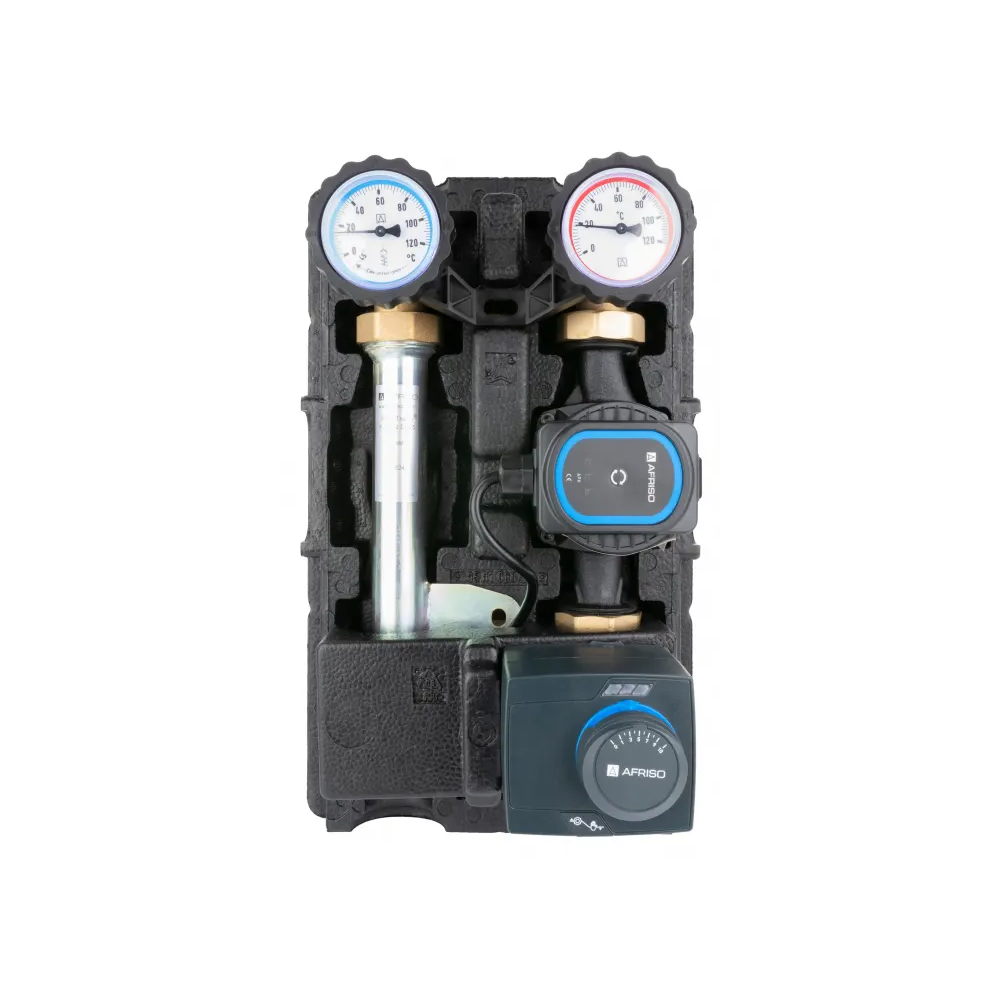 - Zainstalowany zawór mieszający ARV Kvs12, pompa AFRISO APH 25-7/180 oraz siłownik ARM 343 ProClick (3-pkt., 230 V, 120 s).