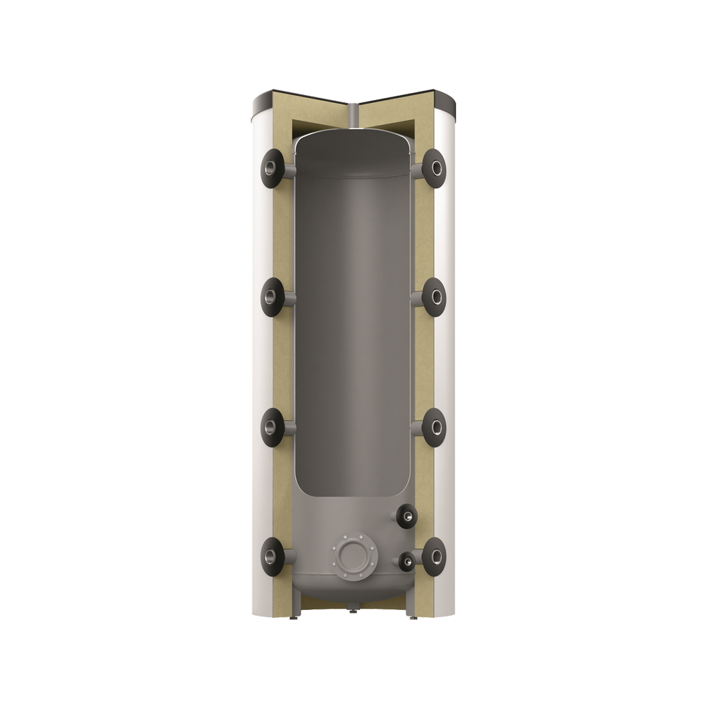 Zasobnik buforowy do wody grzewczej i chłodniczej. W wersji stojącej do wyboru z kołnierzem lub bez kołnierza lub z jedną wężownicą/dwiema wężownicami do podłączenia zewnętrznych źródeł energii.