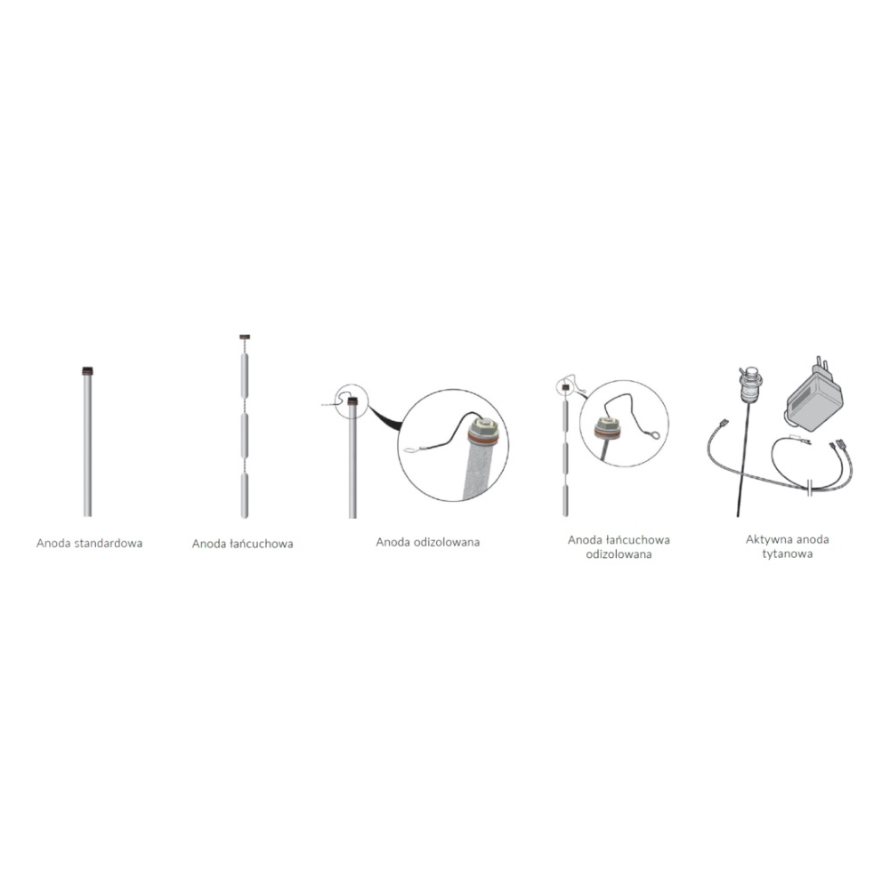 W naszym asortymencie posiadamy anody standardowe, łańcuchowe, odizolowane, jak również anody tytanowe o różnej wielkości oraz rodzaju gwintu. Najwyższa jakość materiałów zastosowanych do produkcji prezentowanych anod oraz kontrola i wymiana pozwolą na utrzymanie wysokiego poziomu ochrony katodowej przez długi czas.
