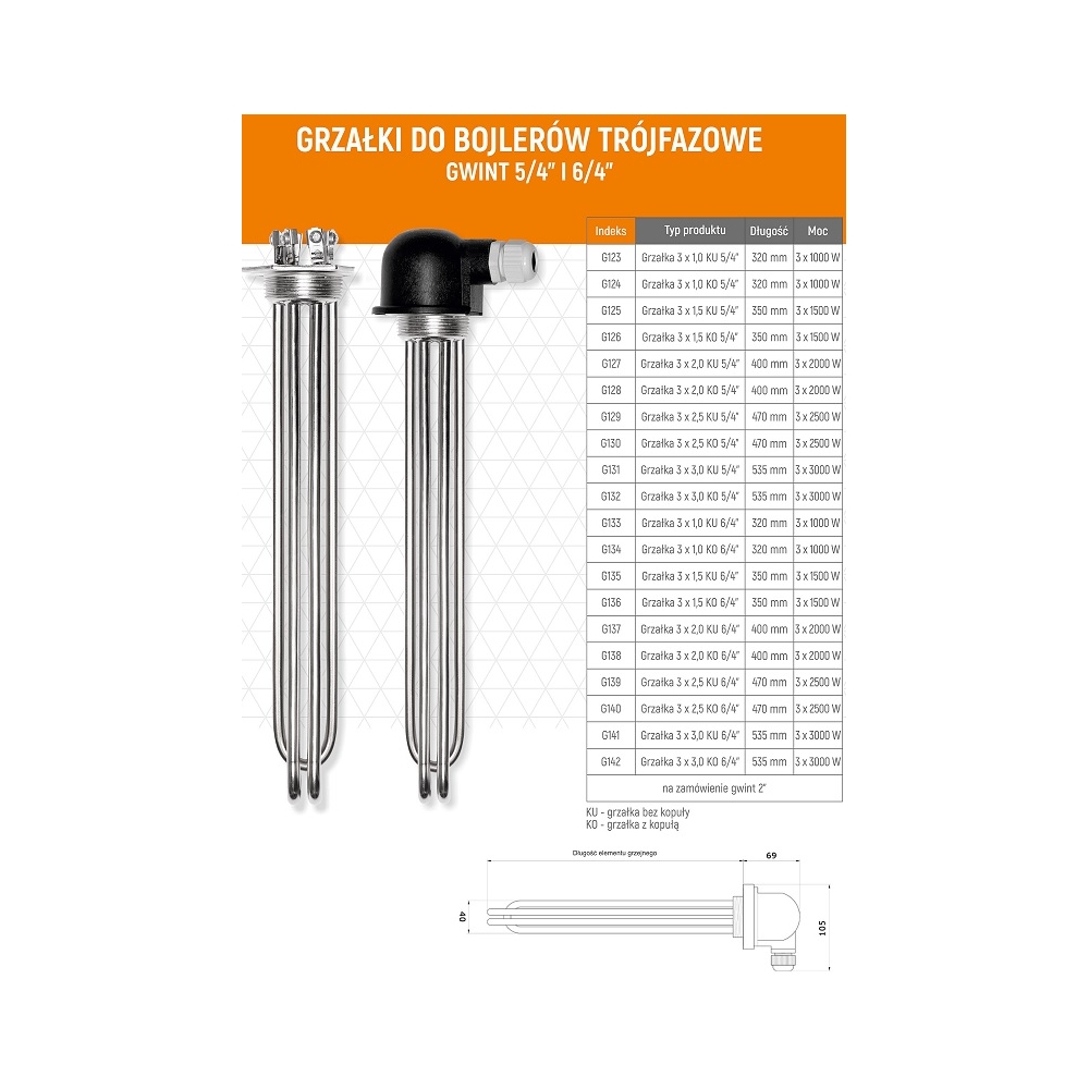 Grzałka elektryczna Gwarant do bojlerów KO trójfazowa 3 x 1 kW 5/4" z kopułą