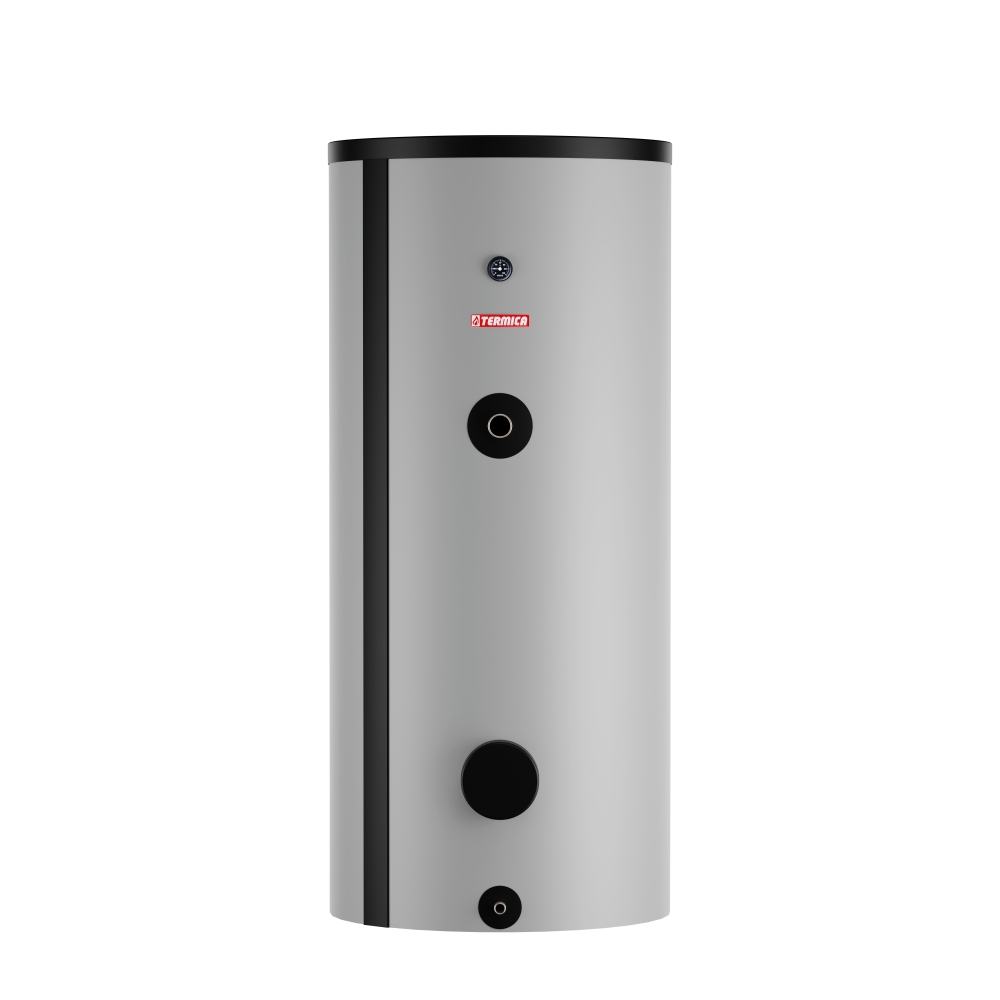 Wymiennik nierdzewny szary stojący 500 litrów z jedną wężownicą spiralną, zaworem bezpieczeństwa i mufą do montażu grzałki 6/4", TERMICA