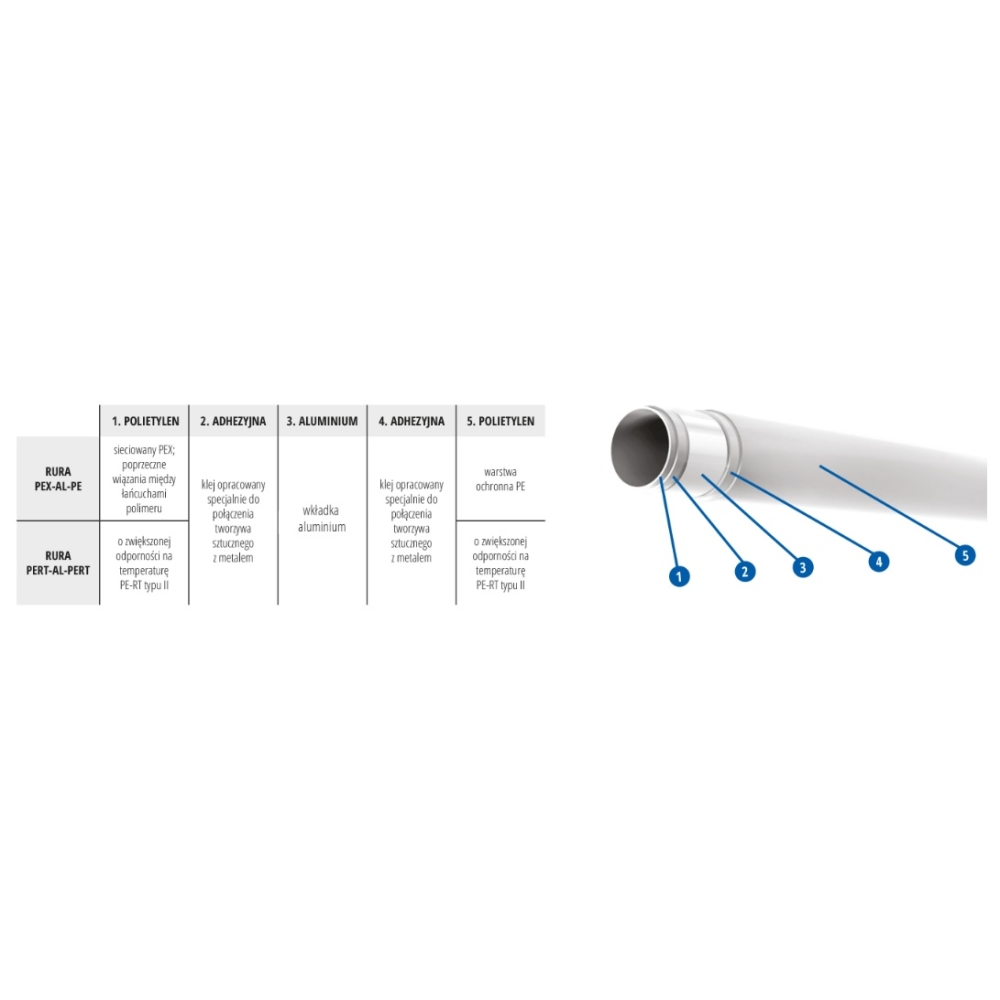 - Poprzez użycie specjalnego kleju, warstwy aluminium jak i polietylenu, nie rozwarstwiają się, a dzięki pełnemu zespoleniu tworzywa z metalem, zmniejszono wydłużenie cieplne oraz zapewniono wyższą odporność na działanie wysokiego ciśnienia.