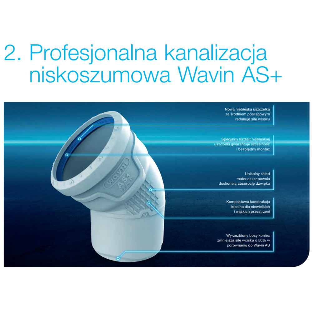 Nowy Wavin AS+ posiada wiele cech znacznie ułatwiających montaż. Nowa niebieska uszczelka ze środkiem poślizgowym redukuje siłę wcisku. Wyrzeźbiony bosy koniec zmniejsza siłę wcisku o 50% w porównaniu do Wavin AS, a znaczniki kątowe pozwalają wyregulować pozycję kształtki montowanej pod kątem względem osi głównej instalacji.