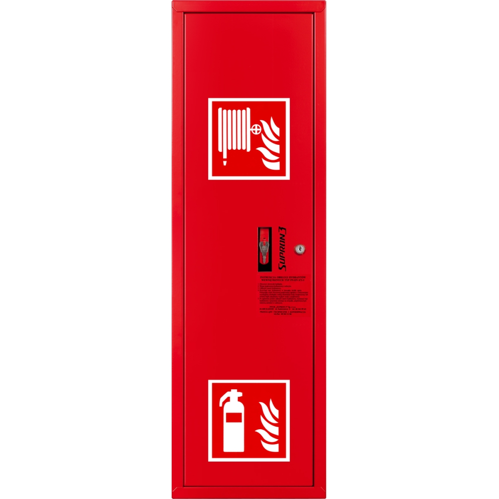 Hydrant DN25 zawieszany boczny z miejscem na gaśnicę, wąż 30m, zamek patent, RAL 3000 lewy o numerze katalogowym S-25-ZBG30-P-3000L w kategorii Szafki hydrantowe, Instalacja przeciwpożarowa. Produkt wyprodukowany przez markę SUPRON, seria Hydranty DN25.