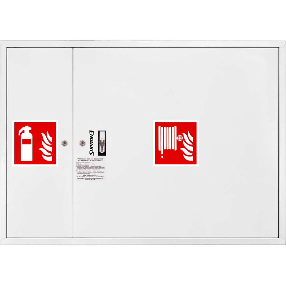 Hydrant DN25 zawieszany z miejscem na gaśnicę obok zwijadła, wąż 30m, zamek patent, RAL 3000 o numerze katalogowym S-25-ZG30-P-3000 w kategorii Szafki hydrantowe, Instalacja przeciwpożarowa. Produkt wyprodukowany przez markę SUPRON, seria Hydranty DN25.