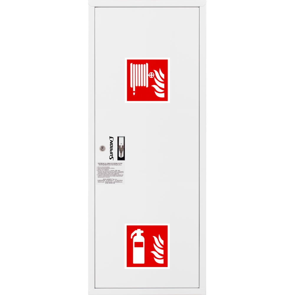Hydrant DN33 zawieszany boczny z miejscem na gaśnicę, wąż półsztywny 20m, ocynk fasada, zamek patent - PRAWY BIAŁY