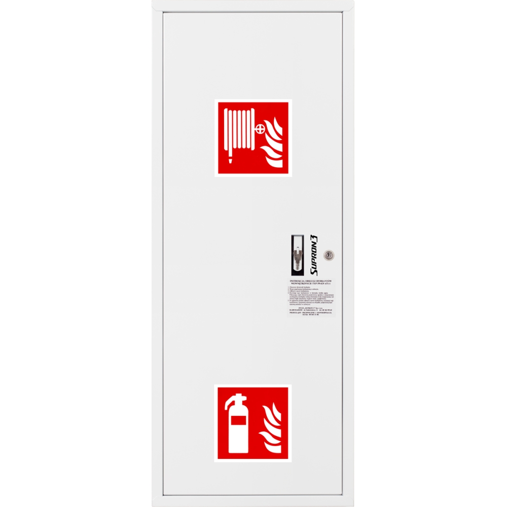 Hydrant DN33 zawieszany boczny z miejscem na gaśnicę, wąż półsztywny 30m, ocynk fasada, zamek patent - LEWY BIAŁY