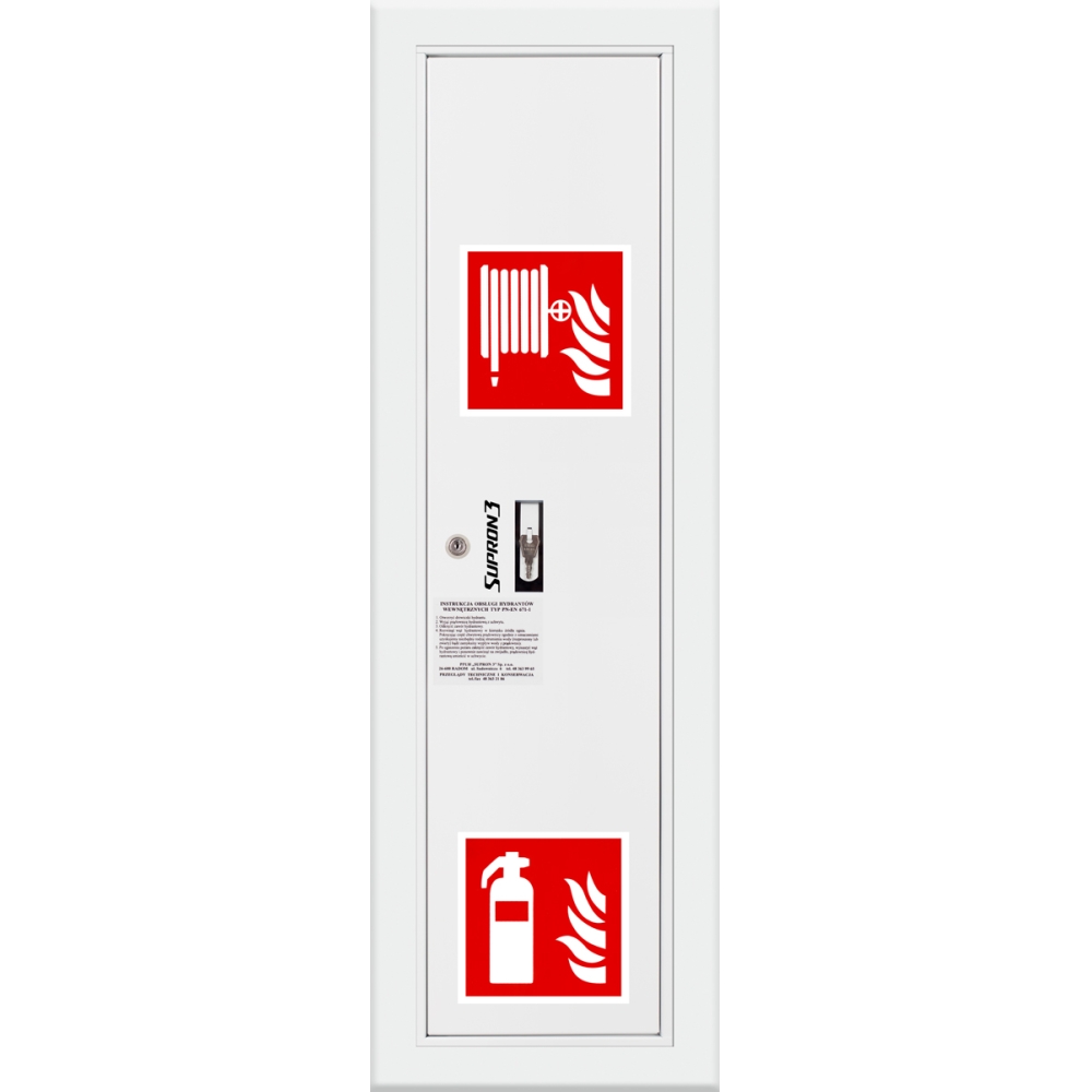 Hydrant DN52 wnękowy boczny z koszem, z miejscem na gaśnicę, wąż płasko składany 15m, zamek patent - PRAWY BIAŁY