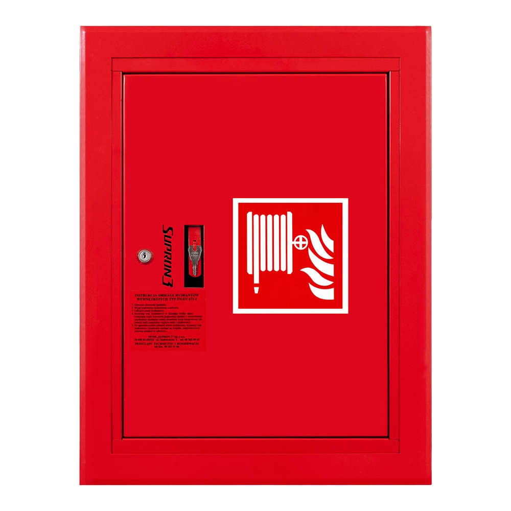Hydrant DN52 wnękowy z kołyską, wąż 15m, zamek patent, RAL 3000 o numerze katalogowym S-52-B215-P-3000 w kategorii Szafki hydrantowe, Instalacja przeciwpożarowa. Produkt wyprodukowany przez markę SUPRON, seria Hydranty DN 52.