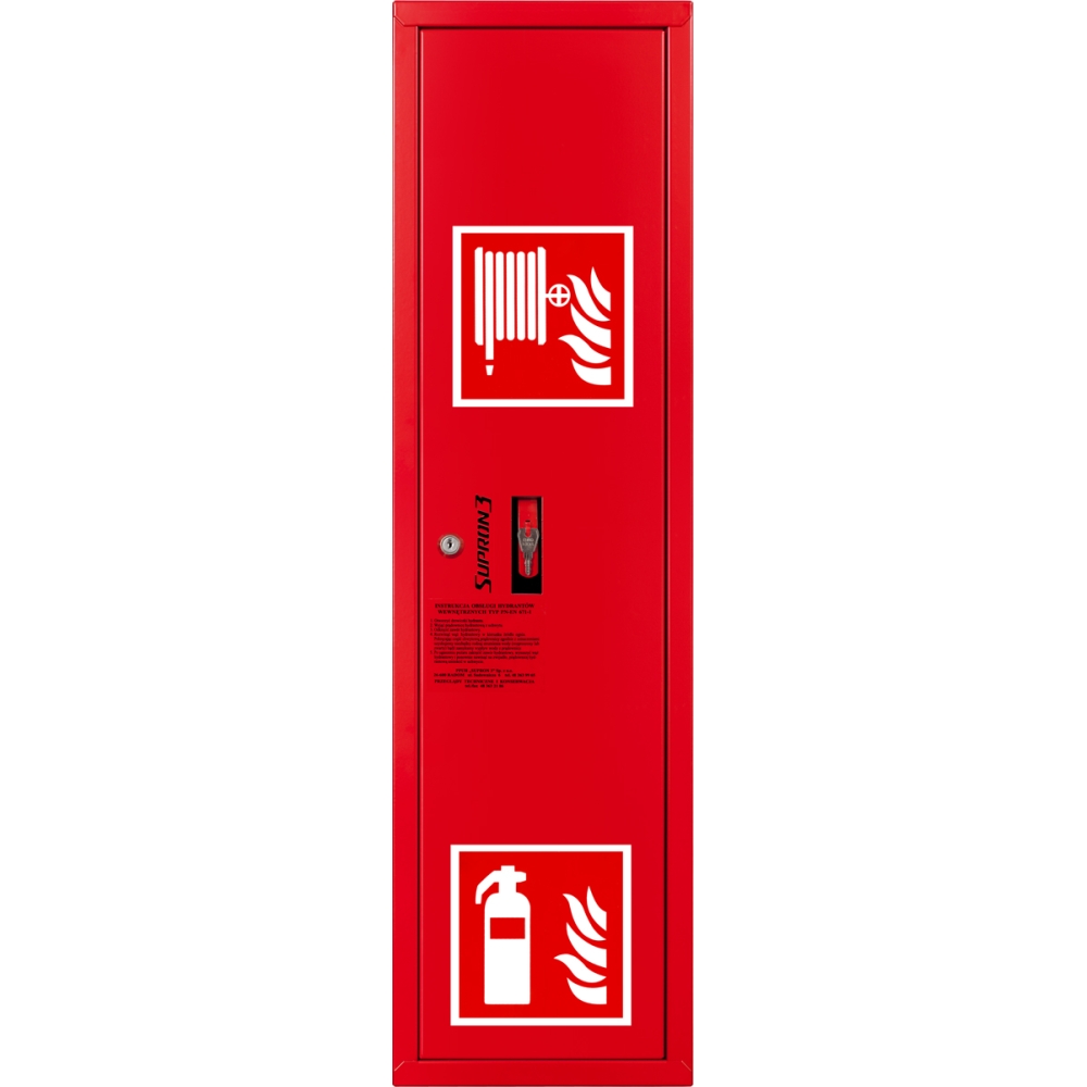 Hydrant DN52 zawieszany boczny z koszem, z miejscem na gaśnicę, wąż płasko składany 15m, zamek patent- PRAWY CZERWONY