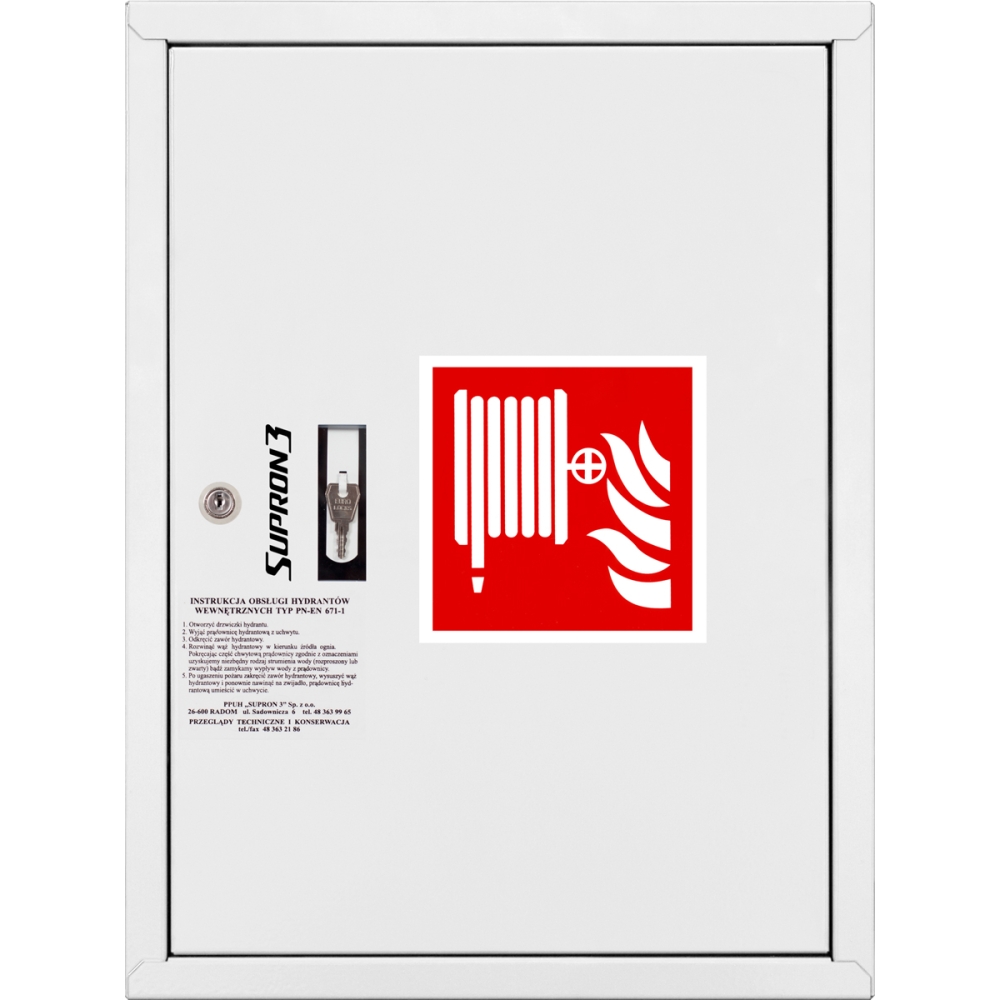 Hydrant DN52 zawieszany z kołyską, wąż 20, zamek patent, RAL 9003 o numerze katalogowym S-52-C220-P-9003 w kategorii Szafki hydrantowe, Instalacja przeciwpożarowa. Produkt wyprodukowany przez markę SUPRON, seria Hydranty DN 52.