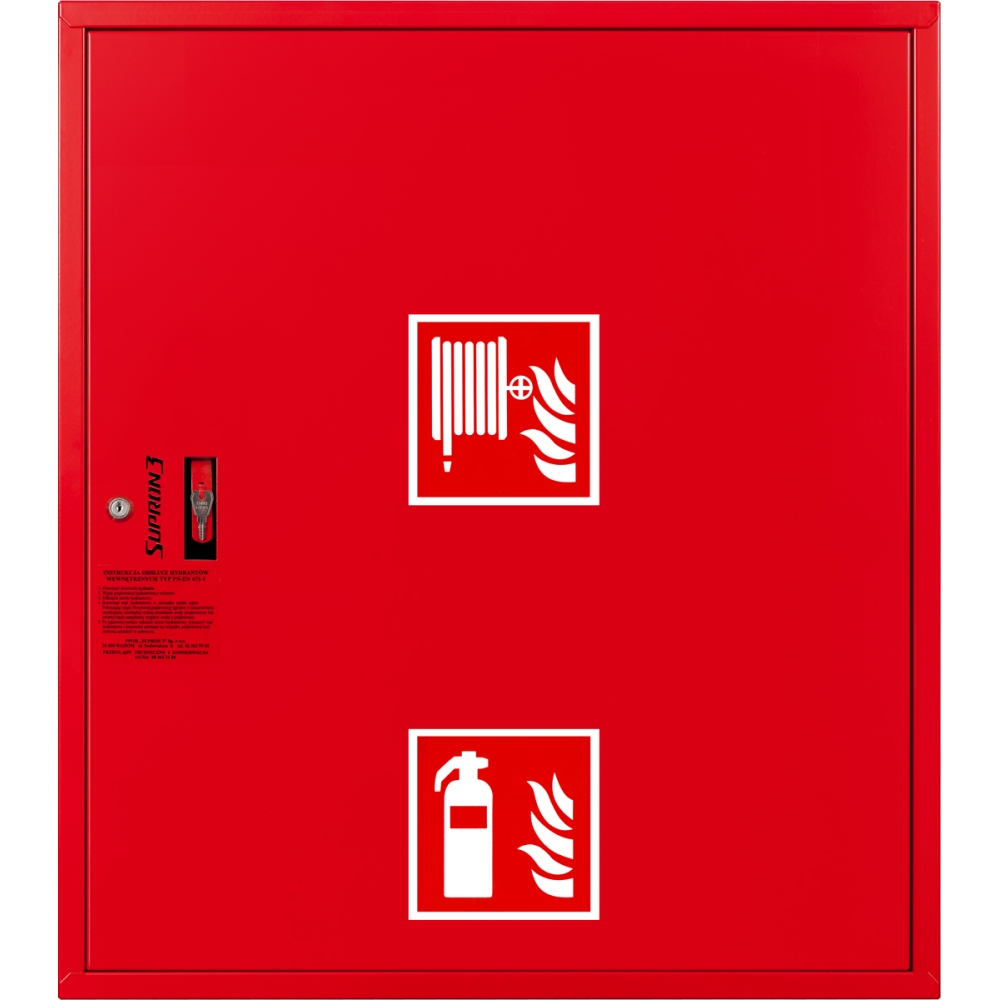 Hydrant DN52 zawieszany z miejscem na gaśnice pod zwijadłem, wąż płasko składany 15m, zamek patent - CZERWONY