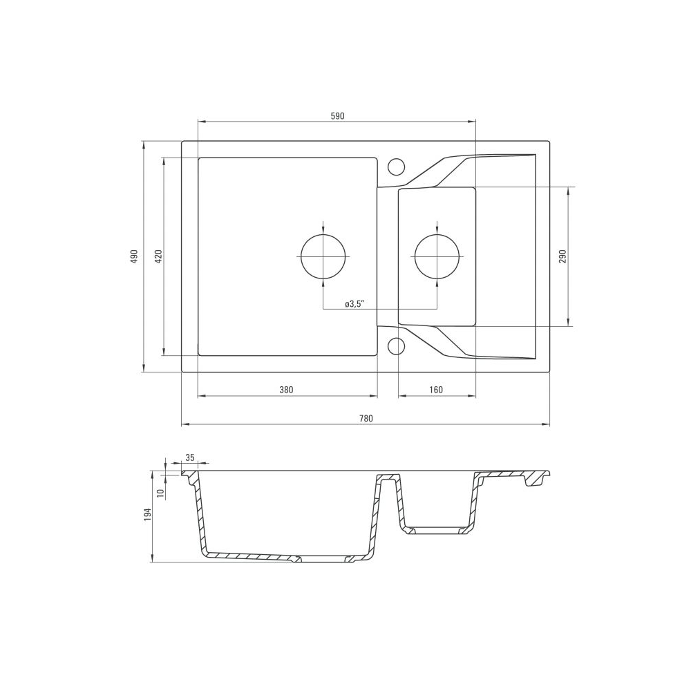Proponowany model wykonano wraz z otworami na baterię i przelewem. Nie brak korka automatycznego czy syfonu w komplecie. Warto zaznaczyć, że opisywane rozwiązanie może mieć mniejszą komorę i ociekacz po lewej lub prawej stronie, wszystko zależy od montażu. Ten nie sprawi problemów, zlewozmywak po prostu wpuszcza się w blat. Długość produktu to 78 centymetrów, a jego szerokość wynosi dokładnie 49 centymetrów.