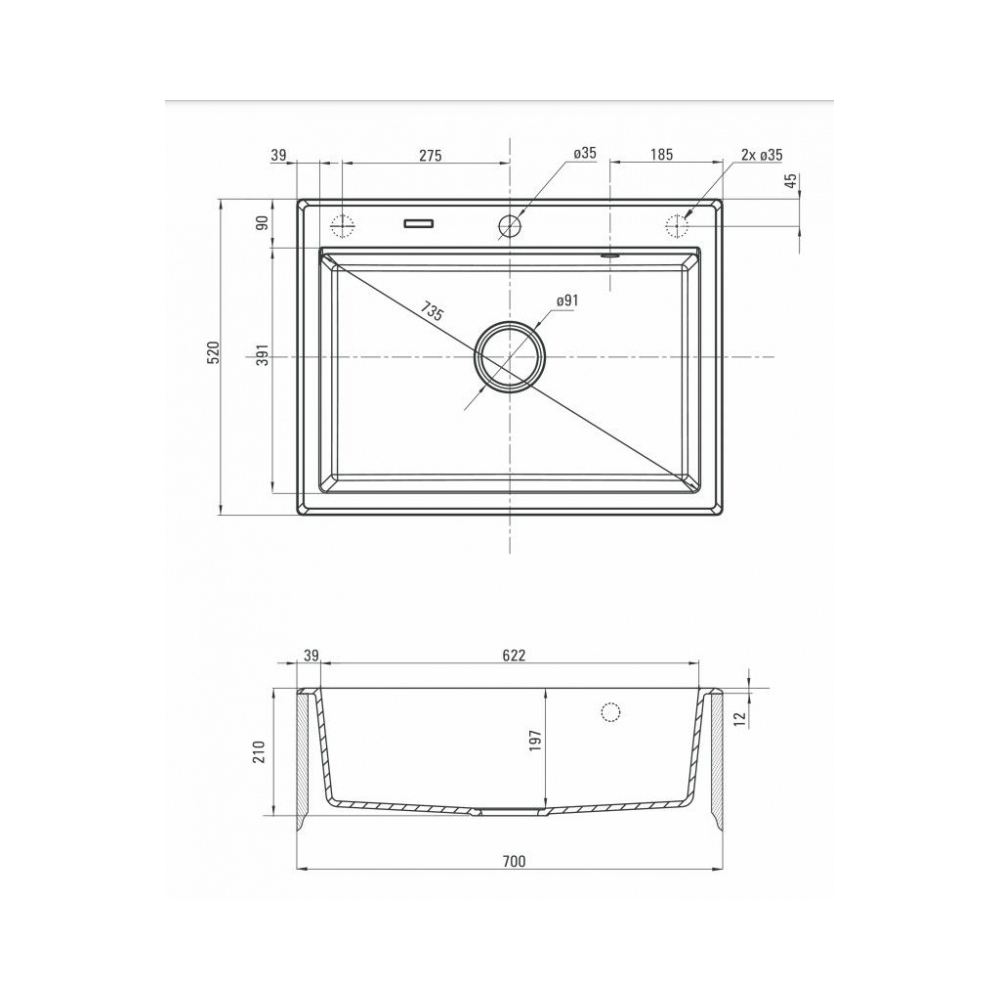 ERIDIAN Zlewozmywak granitowy 1-komorowy 700x520x197 mm z syfonem ALABASTER