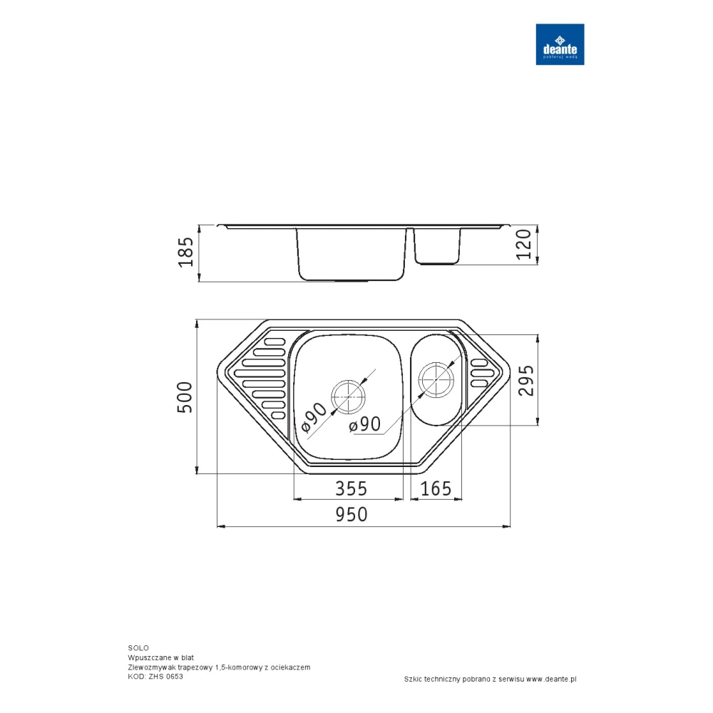 Zlewozmywak 1,5 komorowy trapezowy z ociekaczem stal szlachetna SOLO.