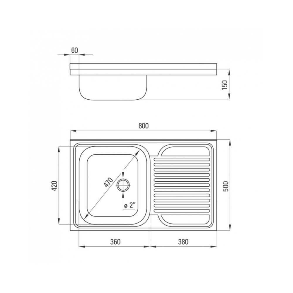 Zlewozmywak 1-komorowy z ociekaczem stal szlachetna ma półmatowe przyjemne w dotyku satynowe wykończenie. Jest to duży zlew o szerokości 80 centymetrów i długości 50, Zlewozmywak posiada ociekacz po prawej stronie. Zlew posiada mały, 2-calowy, odpływ i nie jest wyposażony w otwór przelewowy.