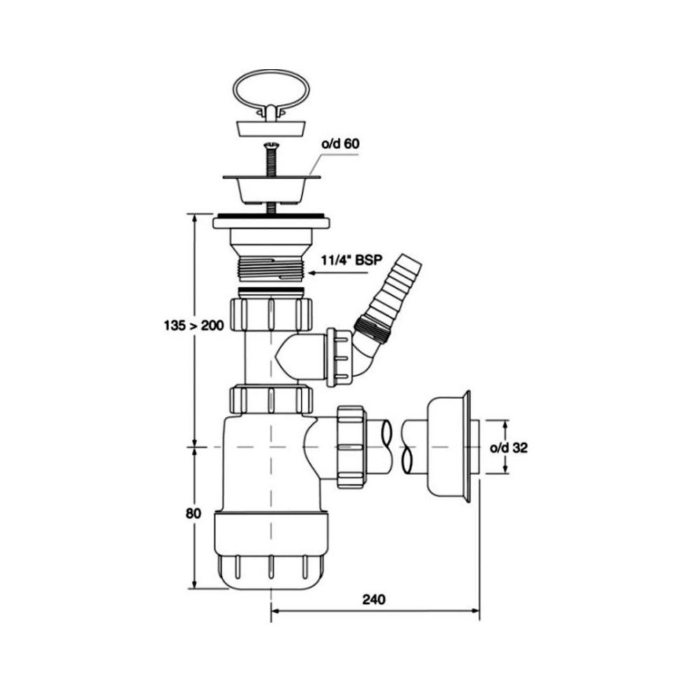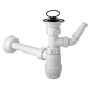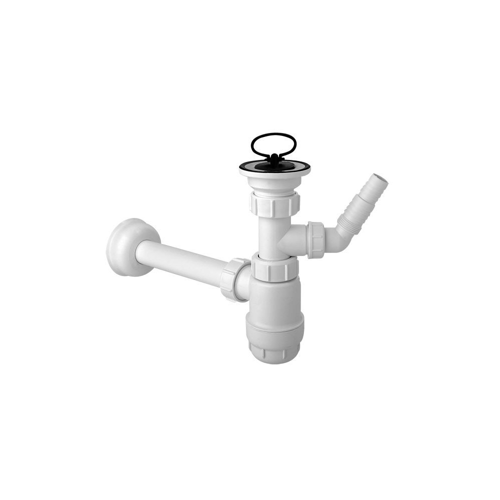 Wykonanie plastikowe, białe, odpływ 32 mm, z podejściem do pralki (zmywarki), sito metalowe, nierdzewne, z korkiem gumowym i uchwytem. Wersja butelkowa. Montaż pod umywalką, natynkowy.