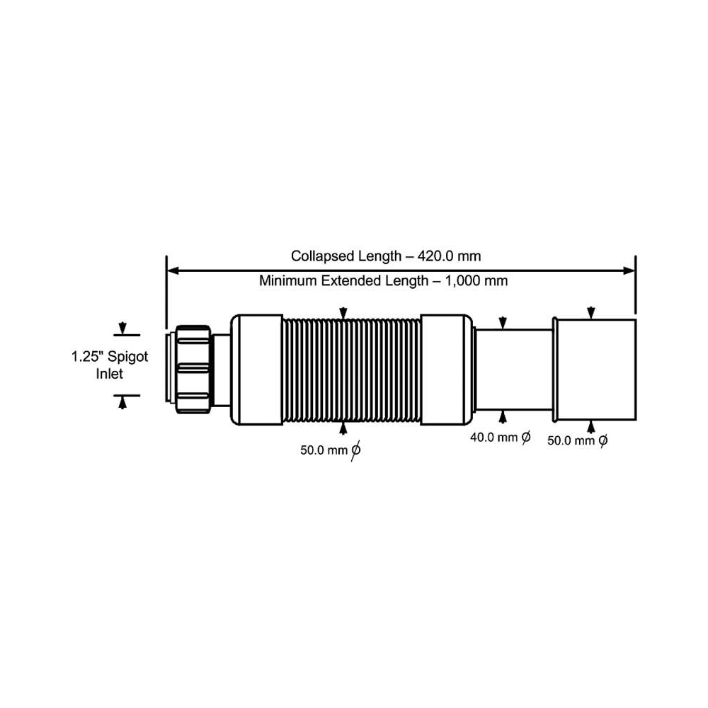 Rura podłączeniowa do syfonów, wykonanie plastikowe, białe. Z końcem bosym 40 mm / 50 mm i nakrętką gwintowaną z uszczelką 5/4", L=1000 mm. Wersja harmonijkowa, z możliwością wygięcia i ustawienia pod dowolnym kątem.Do pobrania
