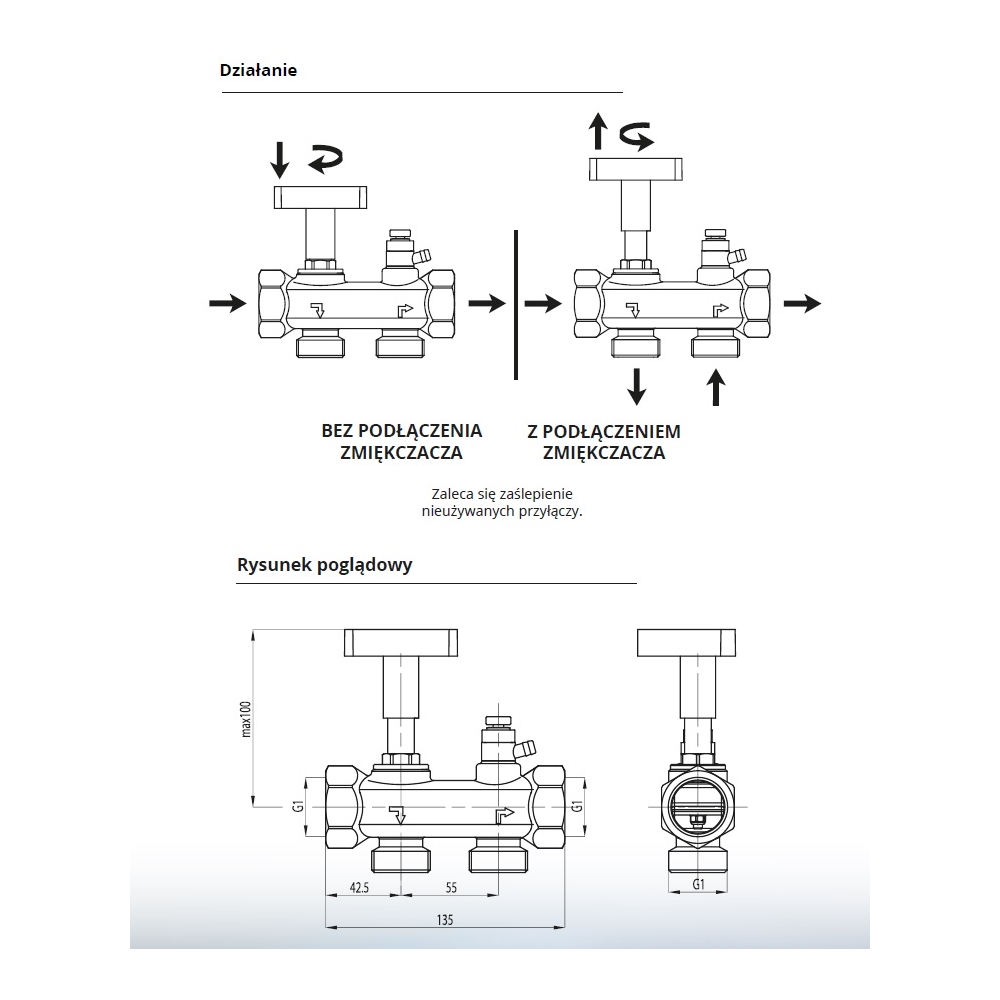 Urządzenie dodatkowo jest wyposażone w odpowietrznik i zawór zwrotny, blokujący przepływ zwrotny do zmiękczacza.